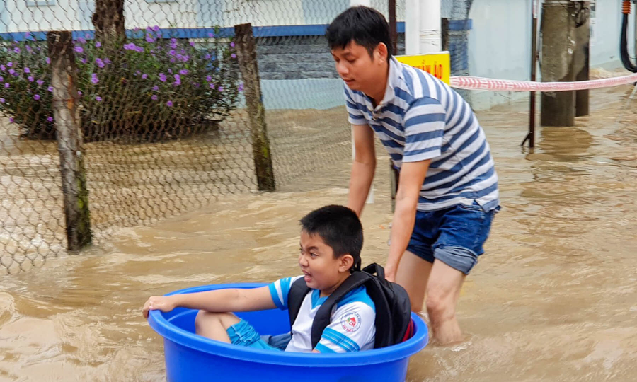 Gia đình lắp máy bơm chống ngập từ nhà ra Phố cổ Nguyễn Văn. Người dân lắp đặt máy bơm nước chống ngập nhà dân trên phố Nguyễn Văn Cổ. Cách nhà khoảng 700 m. Anh Nhựt cho biết: “Em bé hơi nặng, không bế được nên em dùng cách này.” Lũ ở TP.Cần T là lũ đổ ra sông ngược khi triều cường và kèm theo mưa lớn. Ngoài ra, khu đô thị Cần T-City đang lùi dần, mỗi năm 2-3 cm, là vùng dân cư nặng nhất ĐBSCL. -Tràn ngập đầu gối trên phố Dongtong ở Fantongen Hutong thuộc phường Cái Khế, quận Ninh Kiều, bà dùng xô nhựa đẩy con trai đi học cách nhà khoảng 700 m. Anh Nhựt cho biết: “Em bé hơi nặng, không bế được nên em dùng cách này.” Lũ ở TP.Cần T là lũ đổ ra sông ngược khi triều cường và kèm theo mưa lớn. Ngoài ra, đô thị Cần T rung từng ngày, 2-3 cm mỗi năm, là vùng dân cư nặng nhất ĐBSCL. -Trên vỉa hè, cảnh sát cõng học sinh băng qua đường ngập để kịp đến trường. Trường Tiểu học Cai Kai 2 cách khách sạn khoảng 50 m.