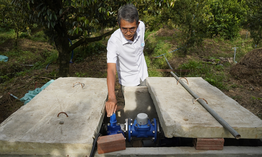 Anh Lộc cho biết, đầu vụ muối năm nay, do không dùng được nước sông rạch nên anh mua 300 tép nước ngọt từ sà lan về tưới cho vườn sầu riêng. Gia đình anh bỏ ra 13,5 triệu đồng với giá 45.000 đồng một con. Từ khi được chính quyền tỉnh đầu tư xây giếng, khu vườn của ông và 24 ha sầu riêng quanh vùng vẫn được giữ nguyên. Nước trong giếng sẽ được đấu nối với đường ống bơm của bể chứa để các hộ dân lân cận dễ dàng dẫn nước trở lại vườn tưới cây. Giá trong tháng 4 là 70.000 đồng một chiếc. Ảnh: Hoàng Nam